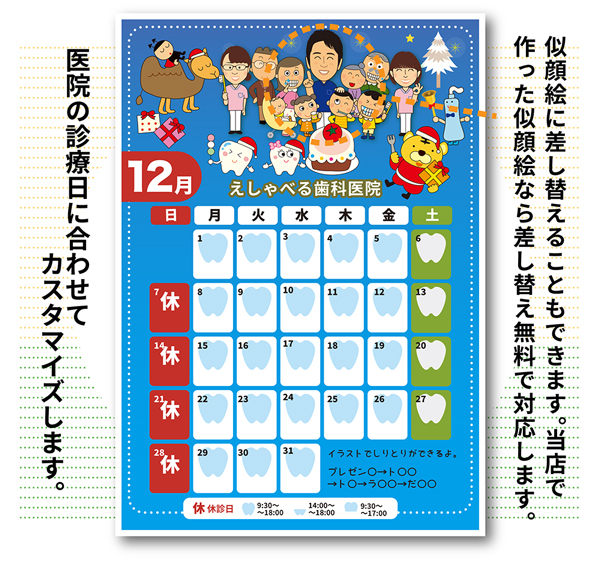 休診日をカレンダーに記載してA3あるいはA4サイズのPDFデータとJPGデータとしてお渡しします。