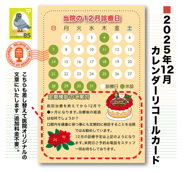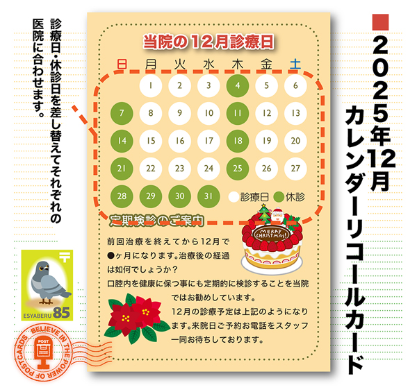 「診療カレンダー予定付きのリコールカード」シリーズの2025年12月バージョンです。