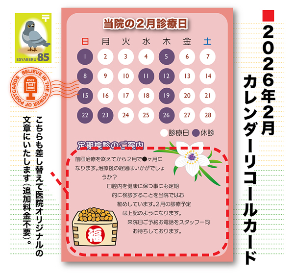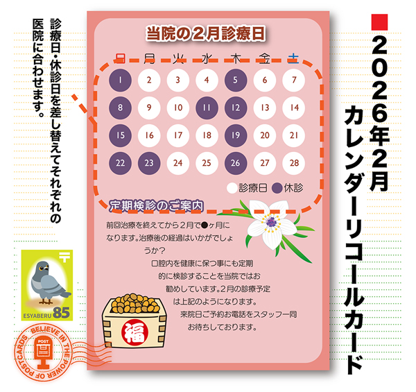 「診療カレンダー予定付きのリコールカード」シリーズの2025年2月バージョンです。